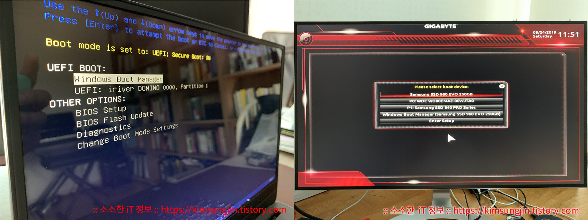 Dell에서 출시한 Inspiron 모델의 경우 F12 키를 연속으로 누르게 되면 아래 왼쪽과 같은 부팅 메뉴를 볼 수 있고, GIGABYTE의 경우 F12 키를 연속으로 누르게 되면 아래 오른쪽과 같은 부팅 메뉴를 볼 수가 있습니다. ▼