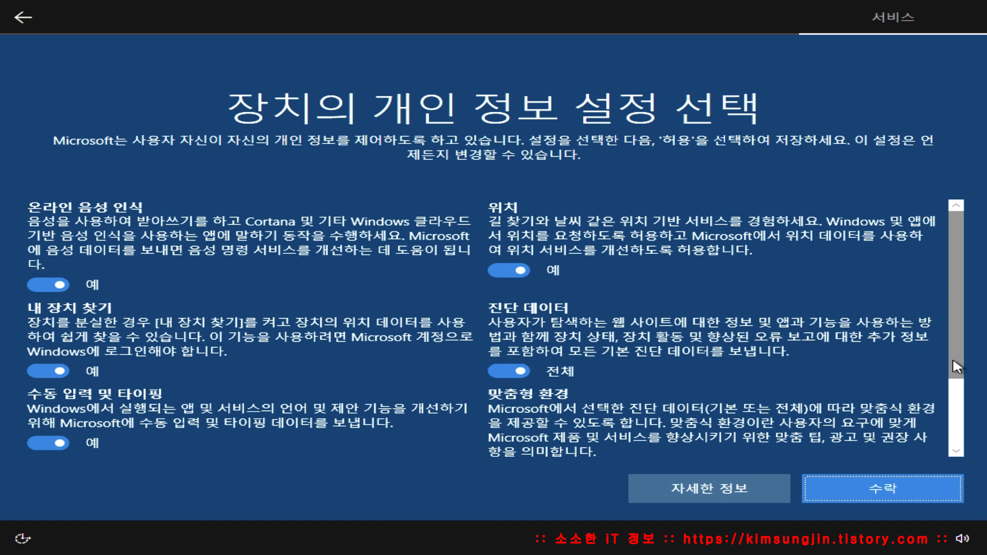 21. 마지막 사용자 설정입니다. "사용자의 개인 정보" 설정 페이지 입니다. 위치정보와 관련된 서비스, 음성 인식 데이터, 각종 입력값 등등이 서비스 개선을 위해 Microsoft로 전송되는데, 이것을 허용할지를 선택하는 것입니다. 잘 읽어보시고 필요없는 서비스는 비활성화 시키면 됩니다. ▼