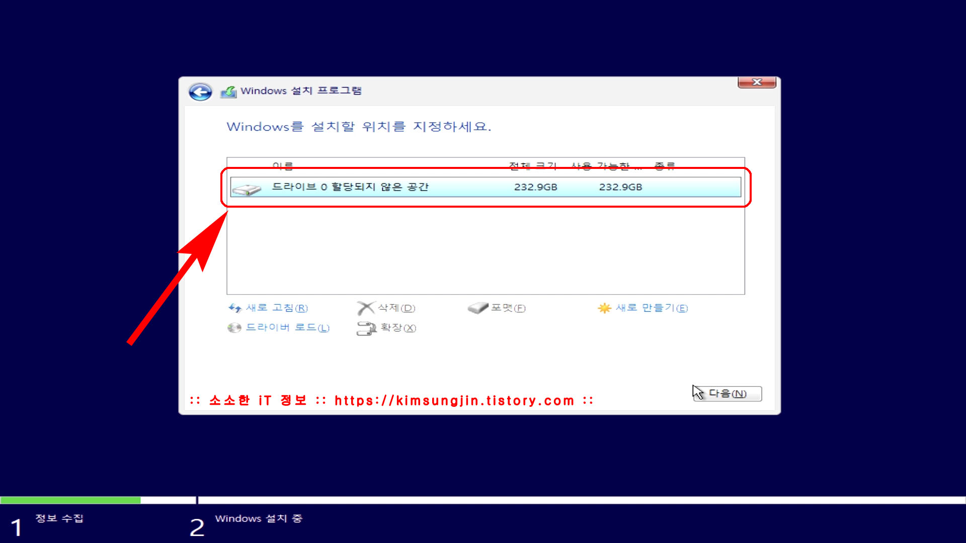 8. Windows을 설치할 디스크를 선택해야 합니다. 만약, 설치할 디스크의 이름에 "드라이브 0 할당되지 않은 공간"이라는 문구가 보인다면 선택 후 "다음"을 클릭하여 설치하시면 됩니다. ▼