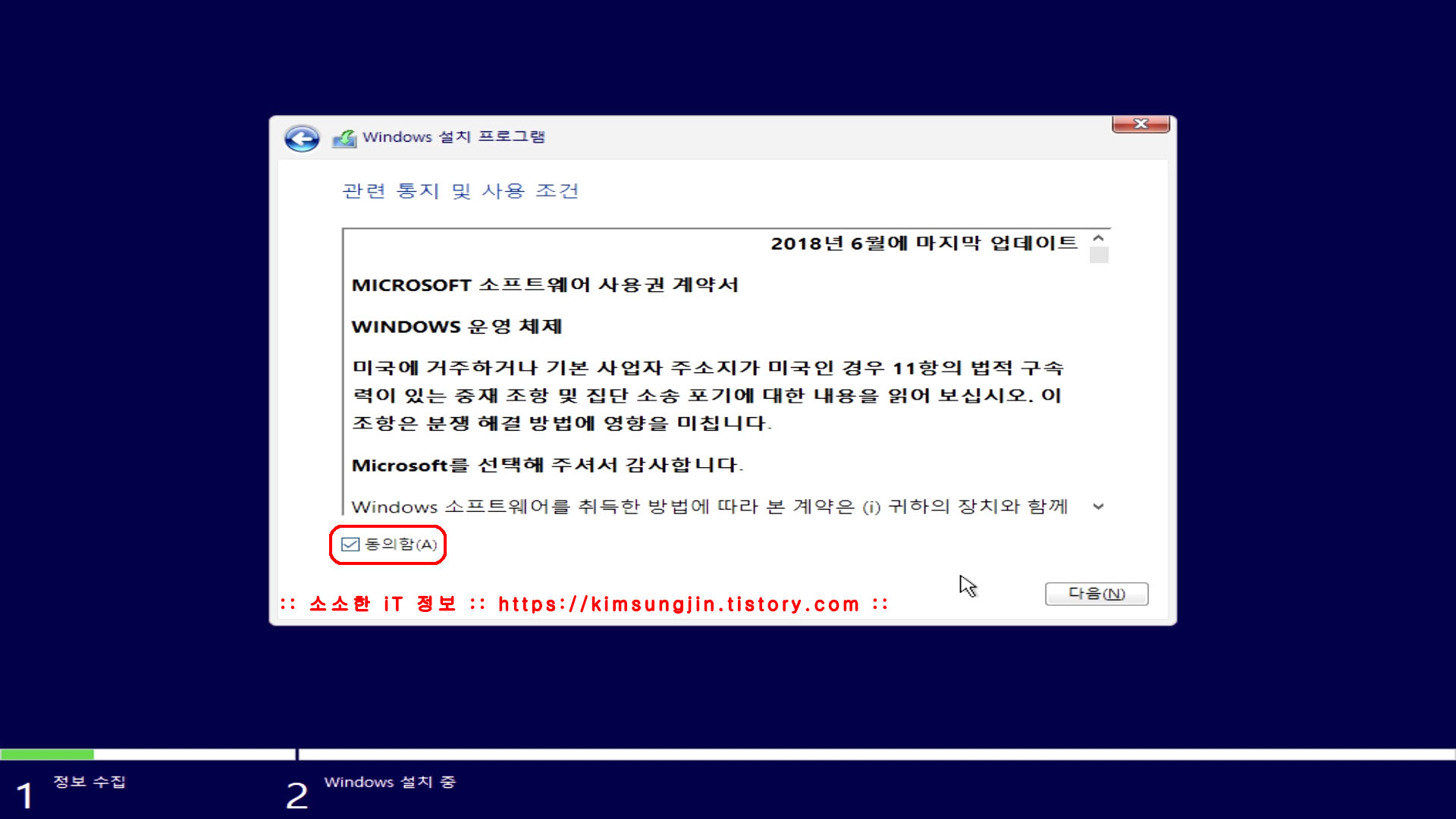 6. Windows 사용권 계약서에 대한 동의를 요구하는 창이 뜹니다. "동의함"에 체크하고 "다음"을 클릭합니다. ▼