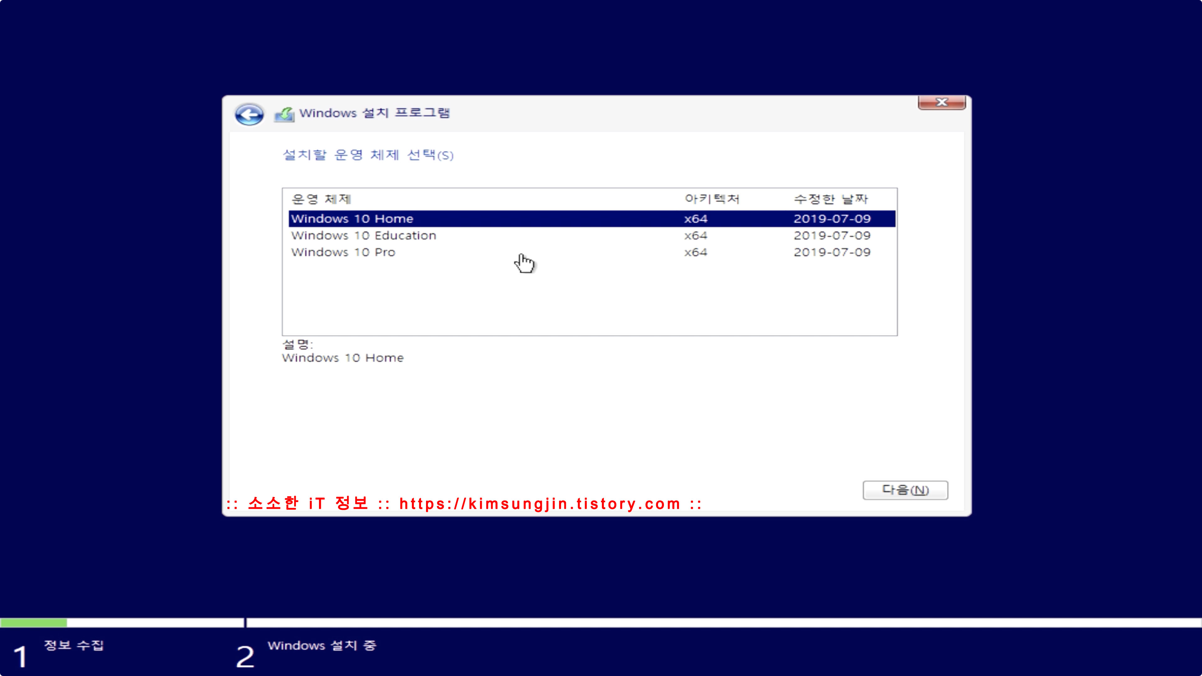 5. 설치할 운영 체제를 선택하는 옵션창으로 넘어가게 됩니다. Home, Education, Pro 중 보유하고 있는 라이선스에 맞는 운영체제를 선택하시면 됩니다. 하지만, 프리도스나 Linux가 설치된 컴퓨터에는 우선 Home 버전을 설치 후 정품인증을 받기를 권해드립니다. 왜냐하면, Home 버전에서 상위 버전인 Pro 버전으로 업그레이드는 가능합니다. 하지만, Pro 버전에서 Home 버전으로 다운그레이드는 정성적인 방법으로 불가하기 때문이죠. 운영 체제 선택 후 "다음"을 클릭합니다. ▼