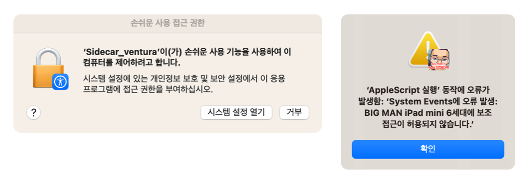 손쉬운 사용에서 설정을 완료 후 다시 SideCar 자동 연결 프로그램을 실행하면 아래와 같이 응용 프로그램을 제어할 수 있도록 허용해야 한다는 메시지를 볼 수 있습니다. 반드시 "확인"을 클릭합니다. 오른쪽 경고 메시지는 "허용 안 함"을 선택한 다음 SideCar 자동 연결 프로그램을 실행한 경우로 응용 프로그램을 제어할 수 있도록 허용하기 위한 옵션이 등록되어 있지만, 비활성화된 경우 나타나게 됩니다. 이런 경우 아래 방법으로 해결이 가능합니다.