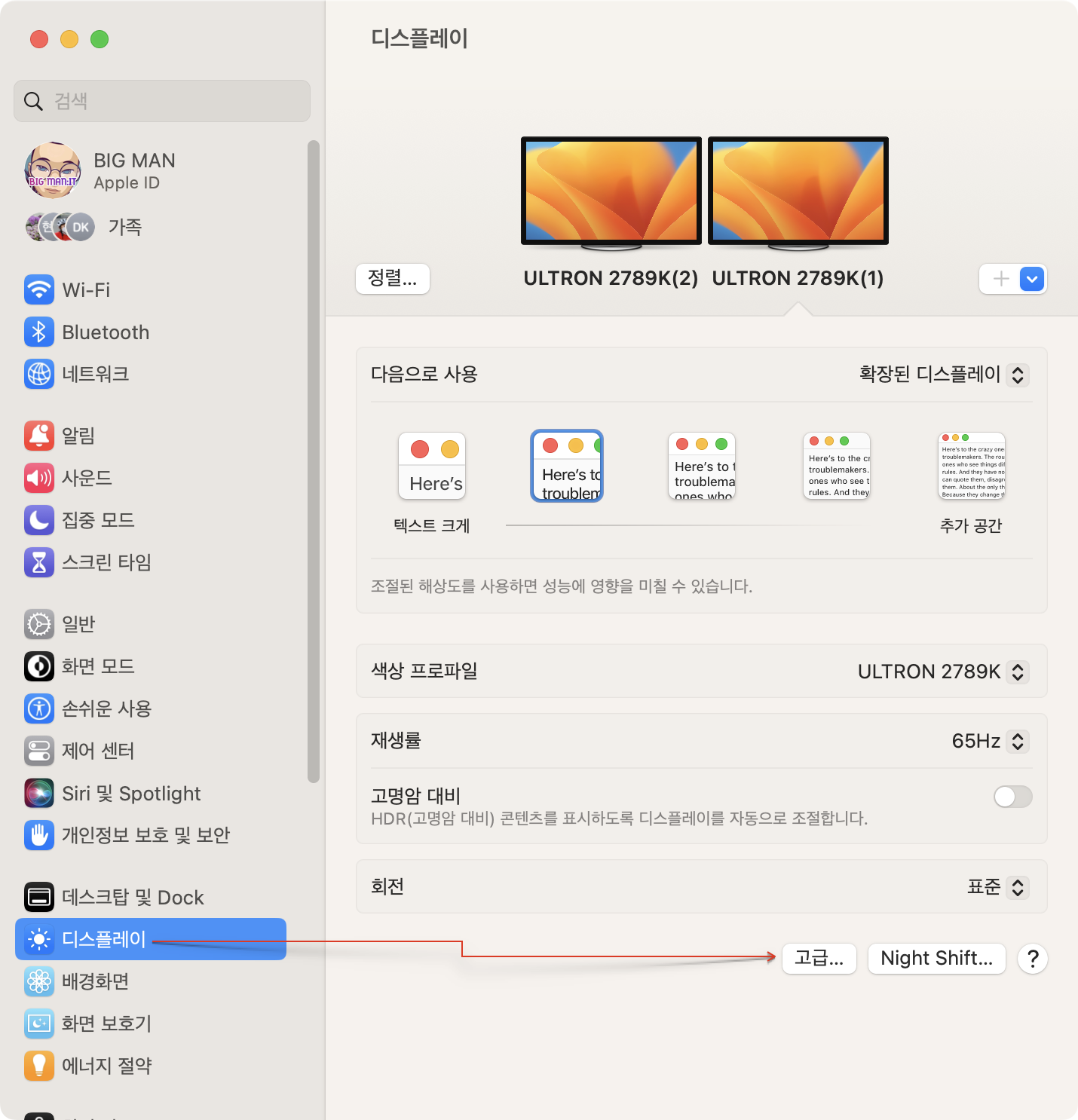 SideCar로 사용할 iPad 이름을 정확하게 확인해 두어야 합니다. 아래와 같이 "시스템 설정 >>디스플레이"에서 확인할 수 있습니다. 필자는 "BIG MAN iPad mini 6세대"를 사용하겠습니다.